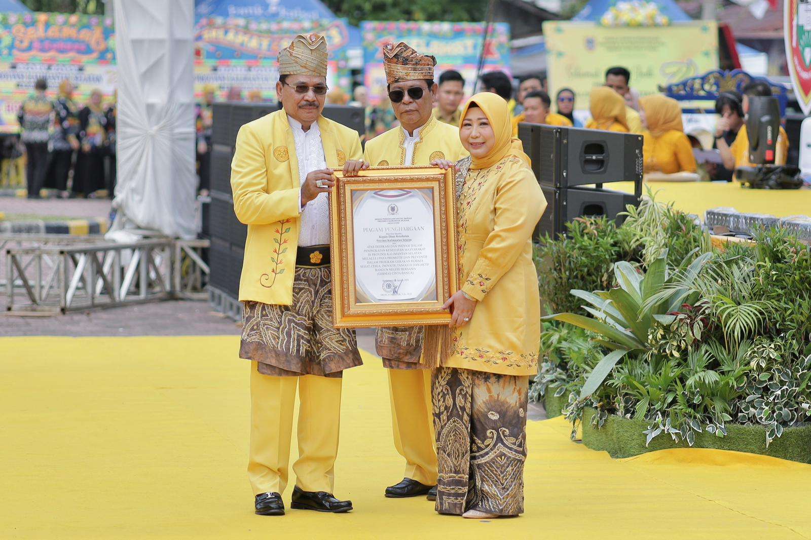 Terakhir, H. Supian HK, memberikan piagam penghargaan kepada Acil Odah, sapaan akrab Hj. Raudatul Jannah selaku Kepala Dinas Kesehatan Provinsi Kalsel yang atas dedikasi dan inovasi dalam peningkatan kesehatan masyarakat di Provinsi Kalsel, melalui upaya promotif dan preventif dalam program Gerakan Remaja Sehat, Ceria, Inovatif, Tangguh, dan Aktif Bangun Negeri Bersama yang disingkat GERMAS CINTA BANUA.