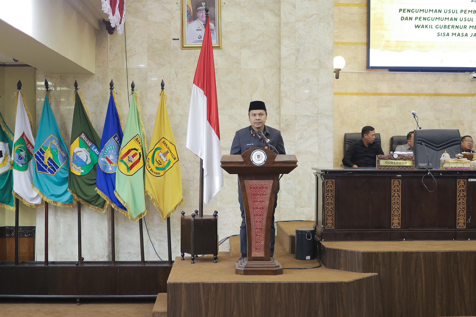 Pengumuman tersebut dikemukakan pada Rapat Paripurna DPRD Provinsi Kalsel, Kamis (21/11/24) pagi, yang dipimpin oleh Wakil Ketua DPRD Provinsi Kalsel, H. Kartoyo, S.M. yang turut dihadiri oleh Pelaksana Harian (Plh) Gubernur Kalsel, Ir. Roy Rizali Anwar, S.T. M.T.