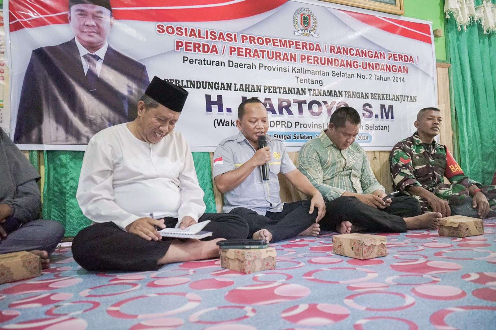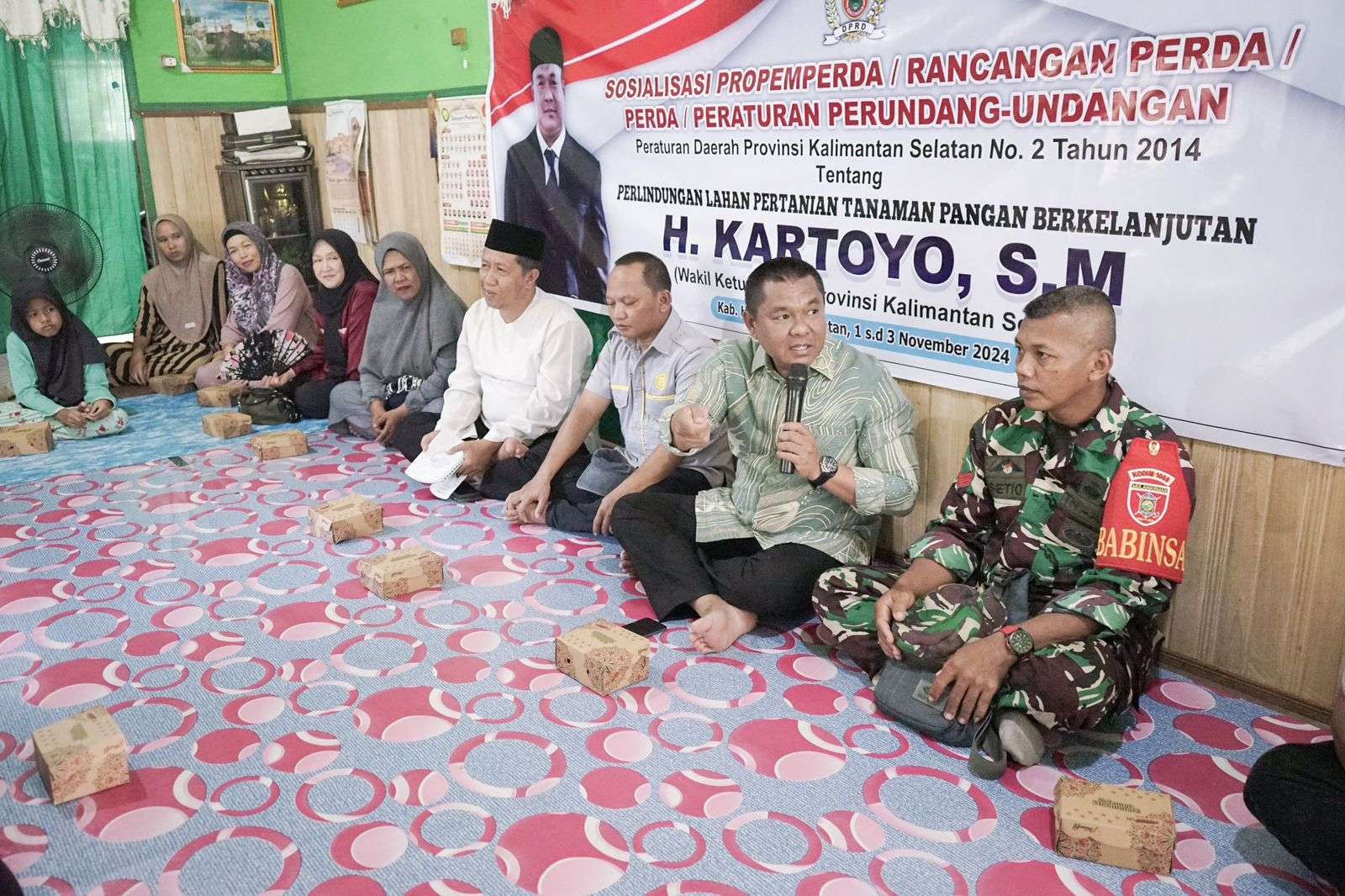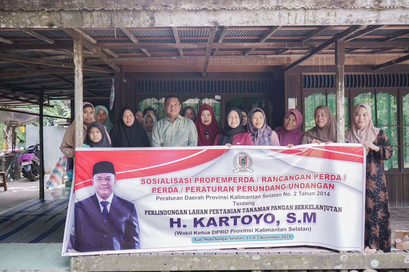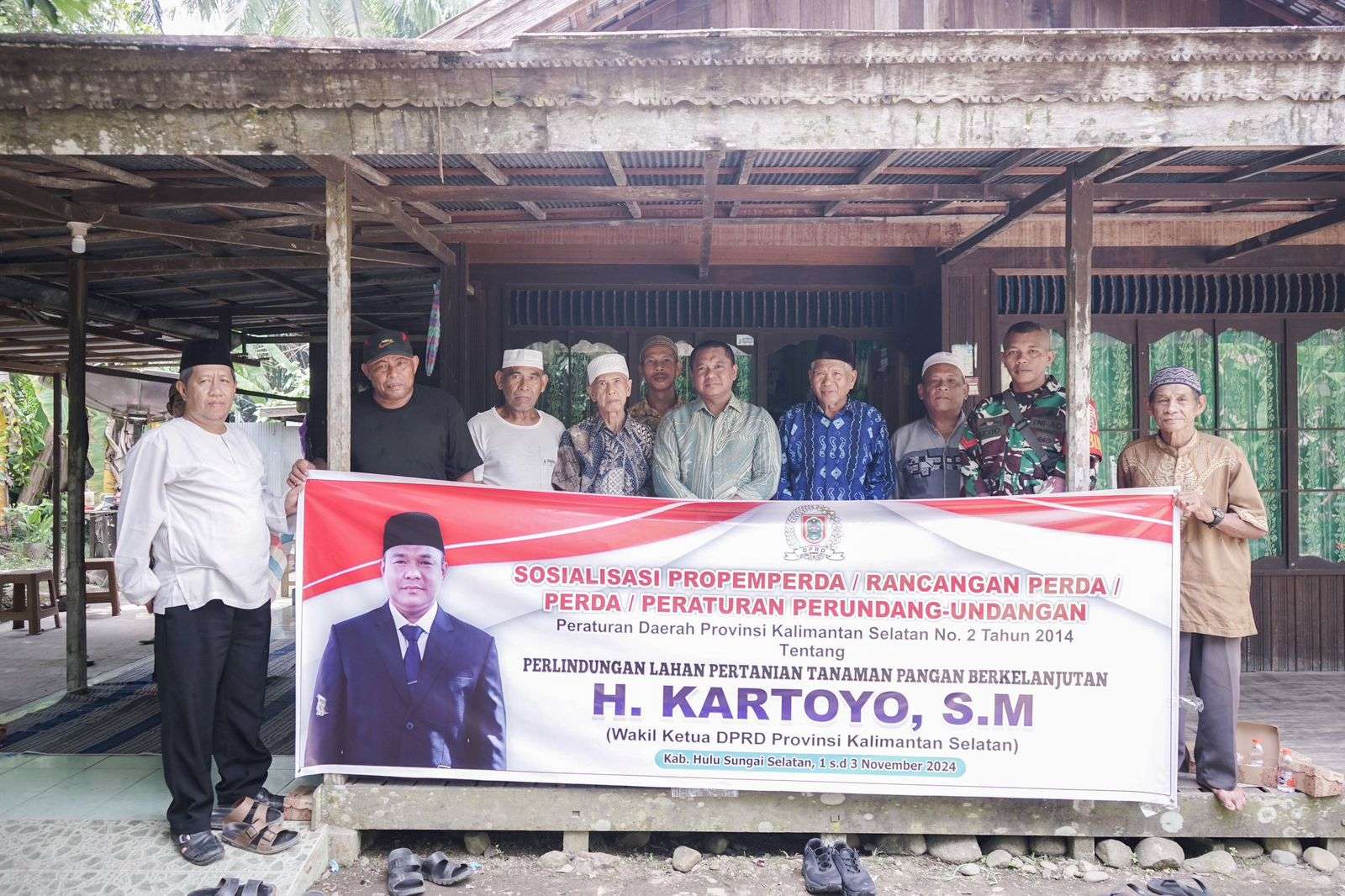HSS, humas- Wakil Ketua DPRD Provinsi Kalimantan Selatan (Kalsel) H. Kartoyo melaksanakan Kegiatan Sosialisasi Peraturan Daerah (Perda) No. 2 Tahun 2014 tentang Perlindungan Lahan Pertanian Pangan Berkelanjutan (PLP2B) yang dilaksanakan di Kandangan Hulu Sungai Selatan (HSS) kecamatan Simpur desa Pantai Ulin pada Jumat, 01/11/2024.